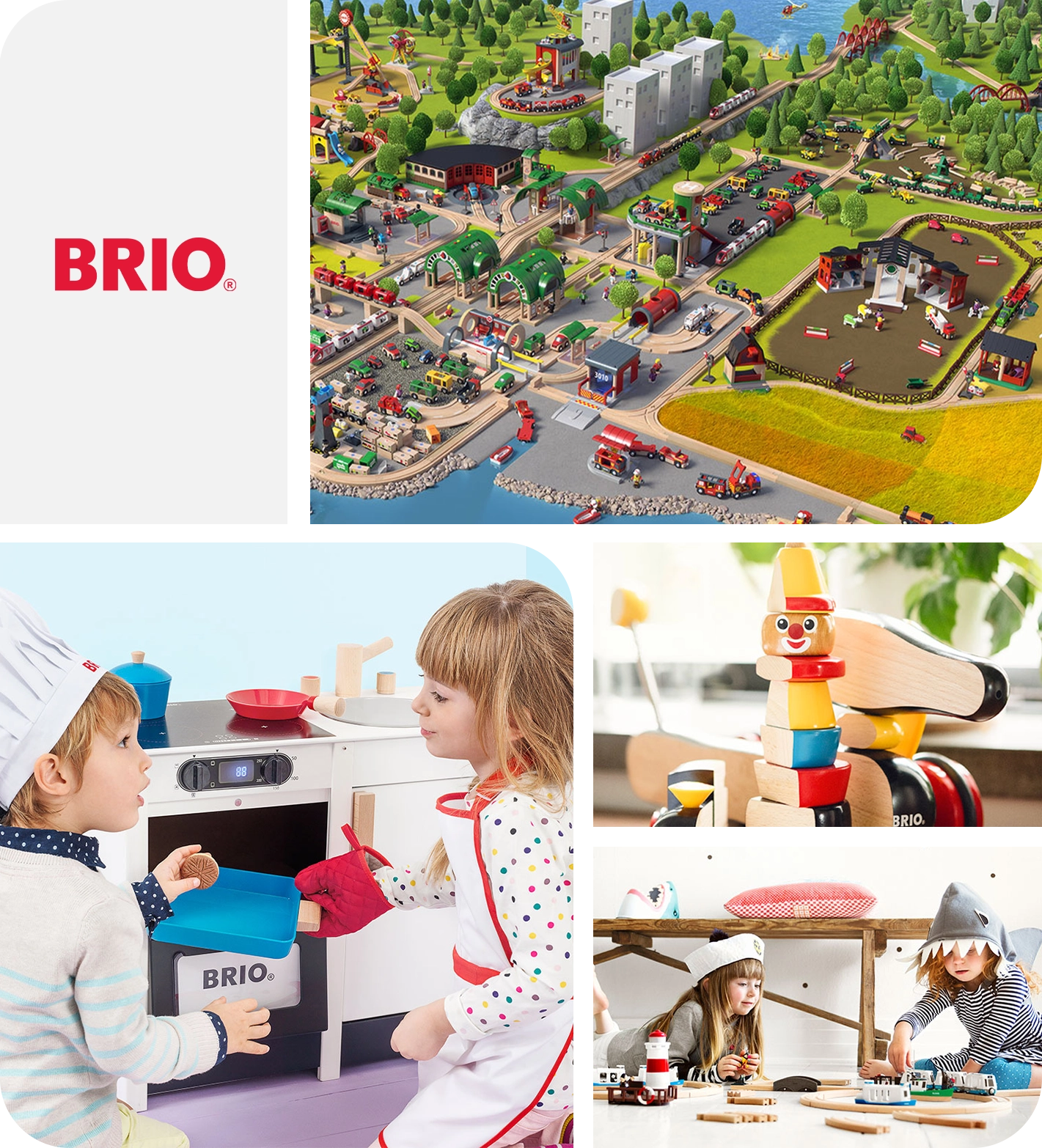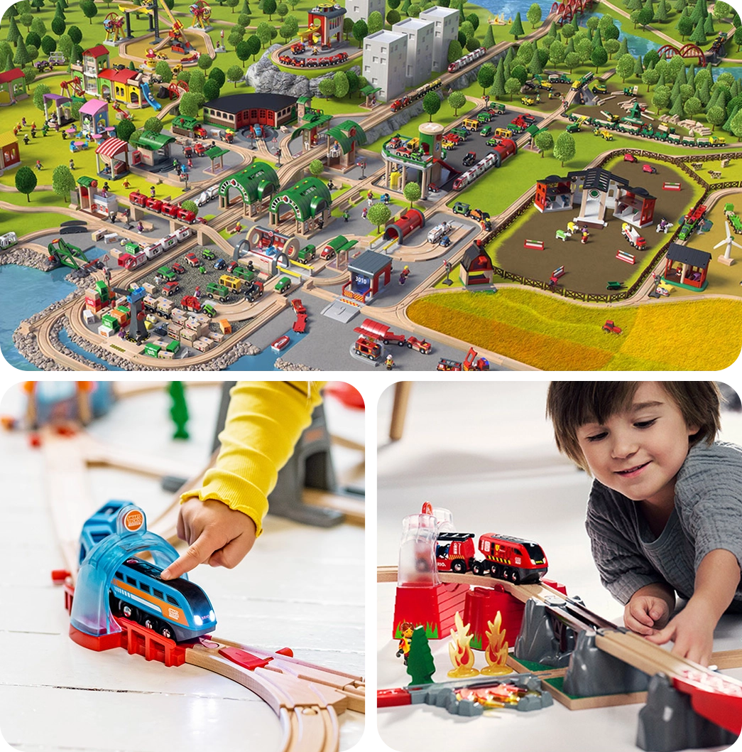 대표 제품인 목재 기차 세트와 확장 가능한 플레이 시스템은 아이들이 자신만의 세계를 만들고 탐험할 수 있도록 설계되어 있습니다. 브리오 제품은 FSC 인증 원목과 안전한 소재를 사용하여